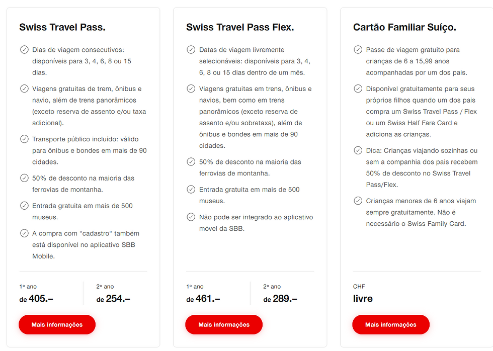 O Swiss Travel Pass é o ticket mais indicado para quem vai visitar várias cidades, montanhas e pegar trens em dias consecutivos. Vários trens e atrações, como musesus, são inclusos no passe ou dão desconto de até 50%. O valor começa em CHF 254 par 3 dias e pode compensar muito em economia. Nunca compramos, pois a gente prefere viagens um pouco mais demoradas em cada cidade e não costumamos subir em todas as montanhas.
